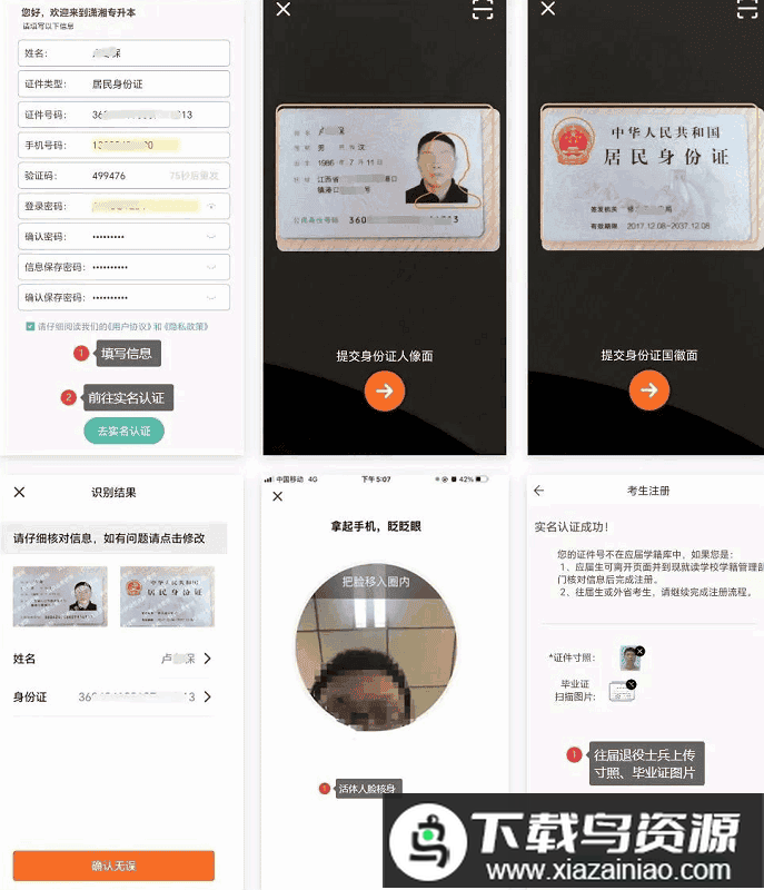 通过潇湘专升本APP输入姓名、身份证号、本人手机号码、登录密码及信息保存密码后进入实名认证;实名认证完成后即注册成功,往届退役大学生士兵还需上传个人证件寸照与毕业证照片。