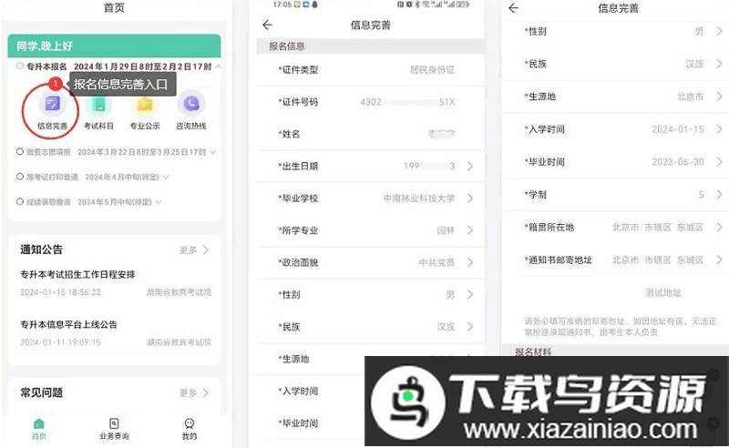 通过APP内的“信息完善”功能填写完整报名信息。我省应届毕业生的个人信息及照片由现就读高校统一导入,考生需认真核对,如有错误应在报名期间联系就读高校修改;往届退役大学生士兵考生则需自行在系统中填报并修改个人信息、照片及毕业证照片。所有考生均需填写籍贯所在地与录取通知书邮寄地址。