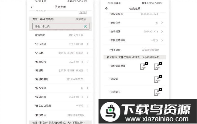 退役大学生士兵:在“信息完善”页面需勾选【专项计划】下的【退役大学士兵】选项,并填写入伍时间、入伍地、退役时间、退役地、退役证编号,同时上传身份证正反面与退役证pdf文件;荣立个人三等功及以上者还需在【是否立功】项选择【是】,填写立功时间、等级、授予单位,并上传立功证书。