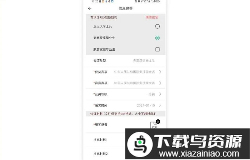 竞赛获奖毕业生:竞赛获奖应届毕业生需在页面勾选【专项计划】下的【竞赛获奖毕业生】选项,填写获奖赛事、赛项、等级、时间,同时上传获奖证书pdf文件。