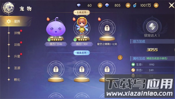 5、宠物培养。通关星空之镜相应关卡后,可设置三名主战宠物与六名辅助宠物;主战宠物建议选择SSR品质,技能与属性更为突出。获得宠物后可进行升级、资质训练与升星;单条资质满级后可突破,持续突破与升星能显著提升宠物战力。