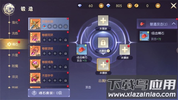 3、镶嵌魂石。每件装备可镶嵌五枚魂石,分别提升攻击、破甲、生命与防御属性;建议优先升级攻击类魂石,其次为生命类,再考虑破甲与防御。同类同级魂石可合成更高等级,大幅增强属性。