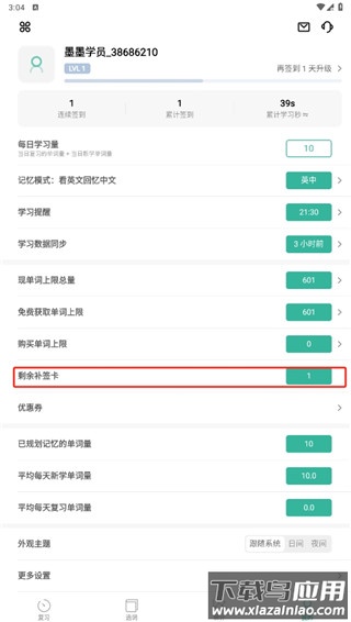 补签卡每月1号会免费发放一张,每位用户最多持有一张;若当月已实现全勤签到,系统将不再赠送补签卡,改为增加20个单词上限。