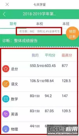 5、点击“答题情况”与“诊断报告”选项,能够深入查看各科分数、班级平均分、年级最高分等数据,同时获取个人历史考试的综合性分析报告。
