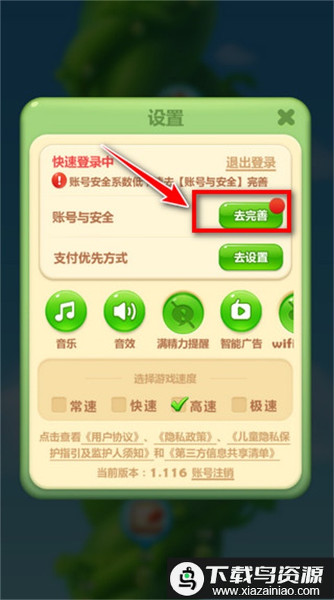 5. 在设置中选择“账号与安全”,点击去完善。