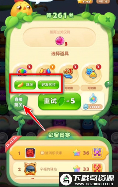 8. 失败界面重试按钮左侧将出现“直接跳关”选项,点击后即可选择好友代打。