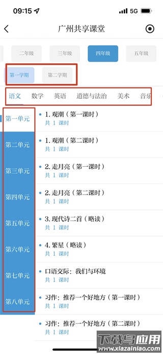 接着选择学期、学科以及具体教材单元。