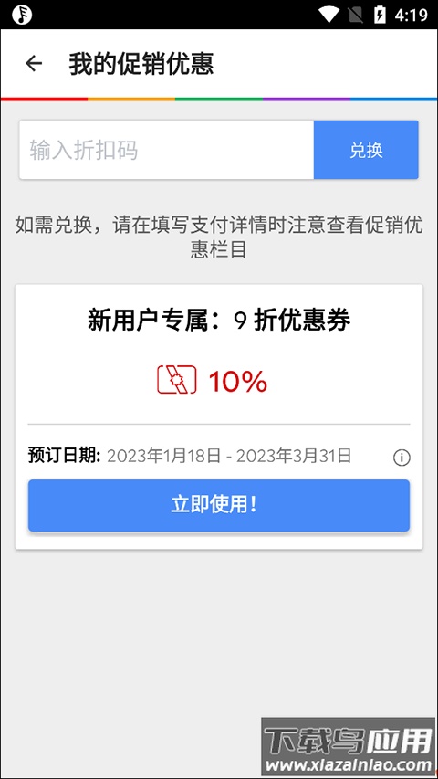 3. 页面显示输入框后,输入优惠券代码并点击右侧“兑换”按钮;也可直接选择下方已拥有的优惠券进行使用。