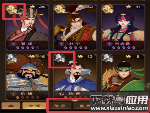 武将分为四个品级,从低到高依次为:良将、名将、盖世、传奇。品级标识位于武将卡牌左上角。