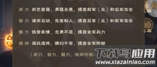 武力、智力、魅力、统帅合称四维,分别影响不同属性: