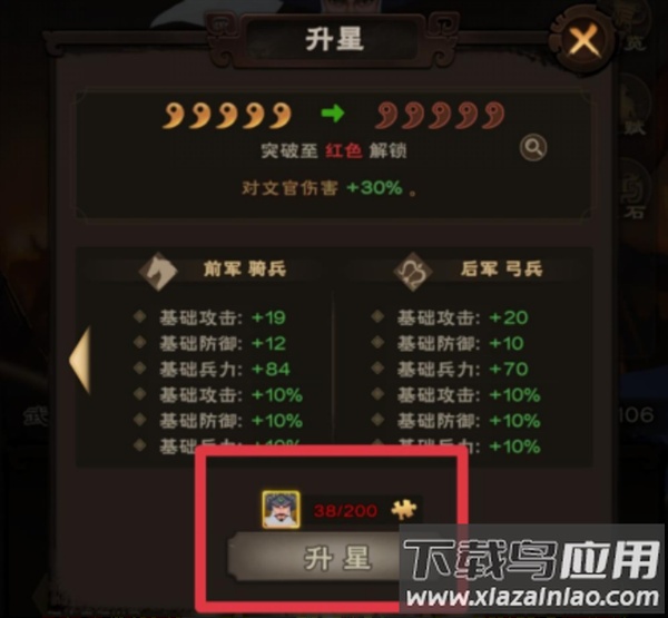 消耗武将碎片可进行突破,每突破6次可升星一次(需消耗大量碎片)。碎片来源包括:访贤府招募、炼魂商店、猎场狩猎、寻访名仕、校场比武及运营活动等。