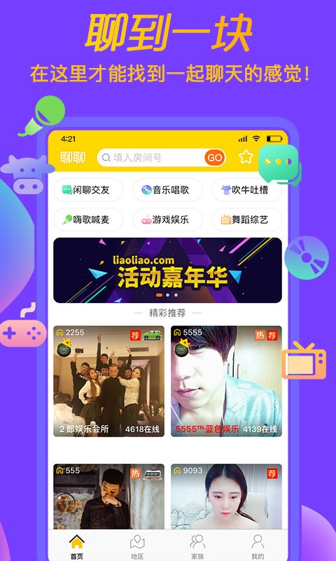 房间可创建于各类兴趣分区或地域分区中,以便结识志趣相投的朋友;
