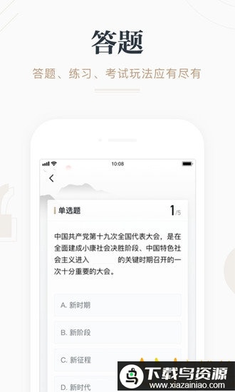 设有形式灵活的答题模块。包含文字、音频与视频题型,每周一答、智能答题及专题考试等功能,帮助用户检验并巩固所学知识。