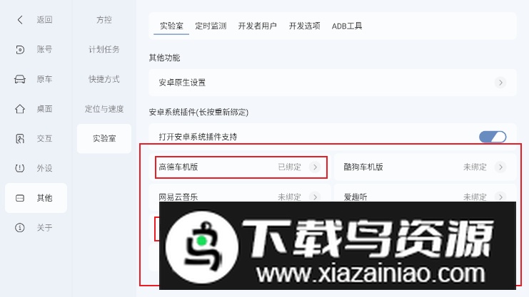 4.开启安卓系统插件支持,选择已安装的高德车机版完成绑定;接着在下方自定义插件列表中选取高德地图插件并保存设置。