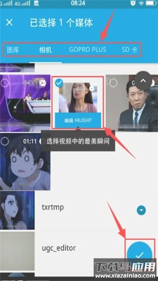 从图库、相机、GoPro Plus或SD卡中选取视频素材,勾选后确认;