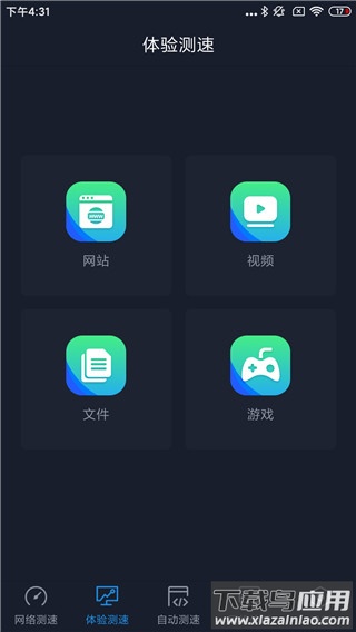 体验测速功能划分为网站访问、视频播放、文件下载、游戏延迟四大类别,用户可根据实际使用场景选择相应板块进行针对性测试。