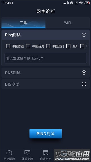 网络诊断分为工具与WiFi两部分。工具页提供Ping测试、DNS测试、DIG测试三项功能;其中Ping测试支持测量中国至全球六大洲的链路性能,可获取延迟与丢包率数据,满足专业用户的深度需求。