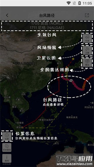 3. 软件内设有台风追踪功能,可查看台风实时风速、移动路径与影响范围;