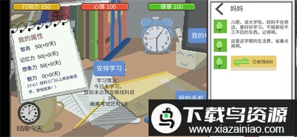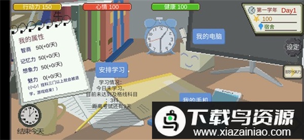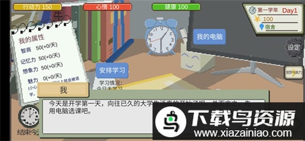 1、游戏初始场景是宿舍的书桌,左侧显示个人属性;桌面上摆放着“我的电脑”、“安排学习”、“我的手机”等可交互物品。