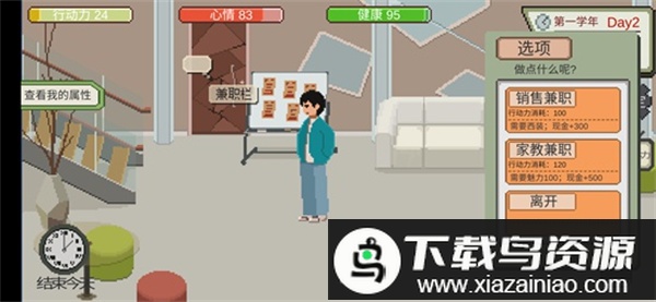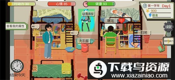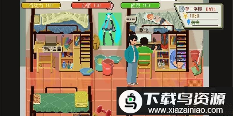 8、离开桌面视角,可以看到宿舍全貌;你有一位名叫“阿宅”的室友,与他聊天或打游戏能提升好感度,后续会得到他的帮助;也可以通过洗衣、拖地等劳动来增加健康值。