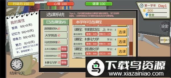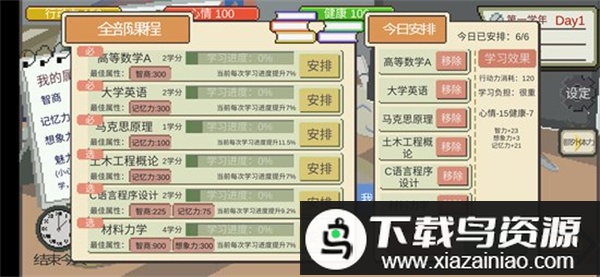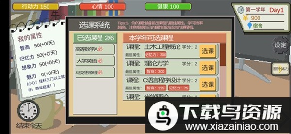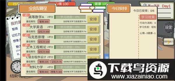 7、每天最多安排六节课程;学习压力过大会导致心情与健康值下降,且每节课都会消耗行动力;行动力类似体力,耗尽后当天无法继续活动,因此不必将课程排得太满,适当放松很重要。