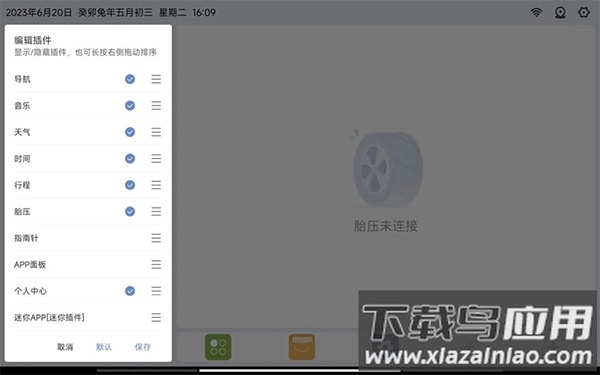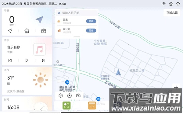 软件默认界面左侧集中显示地图、音乐和天气信息,同时提供胎压与个人数据区域,其中胎压监测需配合对应硬件使用。底部设有可自定义的快捷插件区,中央区域则展示当前选定应用的详细内容。