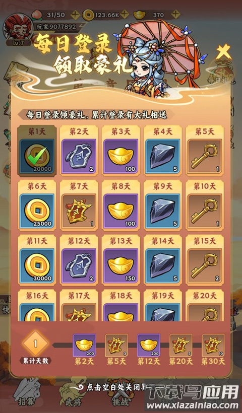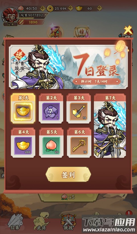 点击右上角签到按钮,领取新手七天奖励,第七天可获得曹操。