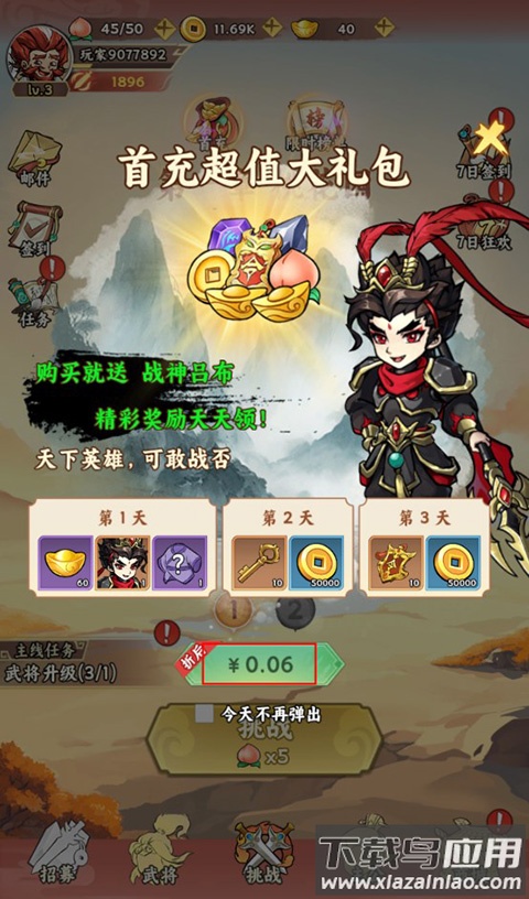 仅需0.06元即可解锁首充礼包,第一天就能领取强力武将吕布。