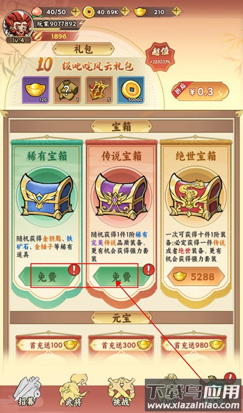 在首页商城处可找到免费宝箱,领取并开启后有机会获得高级装备。