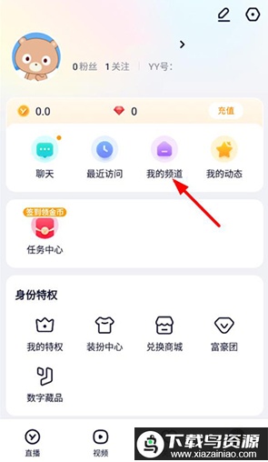 1、打开手机版YY语音应用,在我的页面中找到并点击我的频道选项。