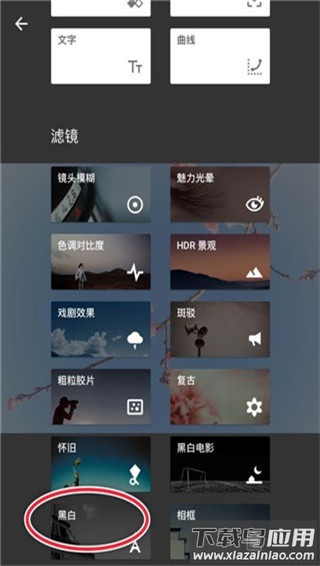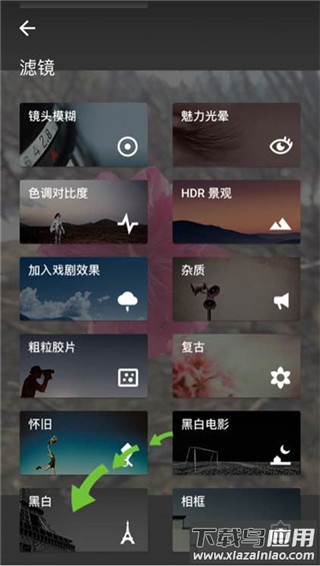 4. 若想进一步改变图片风格,可尝试使用【滤镜】功能。 5. 依据图片内容与个人喜好挑选合适滤镜,例如为营造复古感可选择【黑白】滤镜中的【胶片】效果。