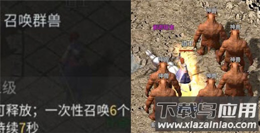 召唤群兽:道士的另一蓄能技能,同样需等待能量积蓄完成。消耗所有能量,发出远古呼唤,瞬间召唤大批神兽加入战场,与原有的神兽及灵兽一同形成千军万马之势,所过之处皆被荡平,气势恢宏。