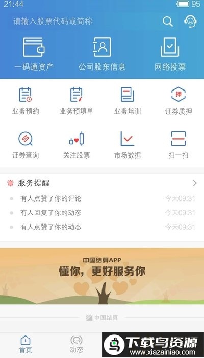 中国结算app为投资者提供便捷的结算服务支持,用户可在线预约办理业务并参与培训,也能随时查询证券信息与市场动态,所有关联服务项目都会及时推送提醒,确保用户掌握最新情况,喜欢的就在本站下载。