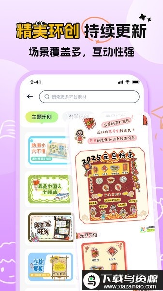 拥有海量环境创设素材,支持下载打印,符合教育性、儿童化与艺术化的要求,帮助轻松完成幼儿园环创设计;无论是主题墙布置、走廊装饰还是区域环境打造,都能在这里找到灵感,让教室每个角落都成为寓教于乐的空间。