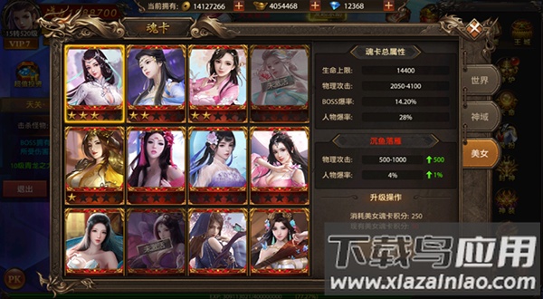 3、美女魂卡:通过收集美女魂卡提升人物爆率,最高可达100%;