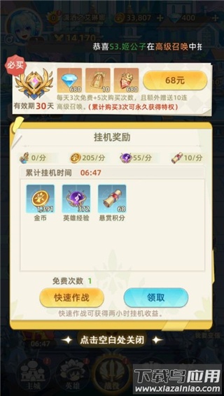 2、快速作战能一次性获取两小时挂机收益;