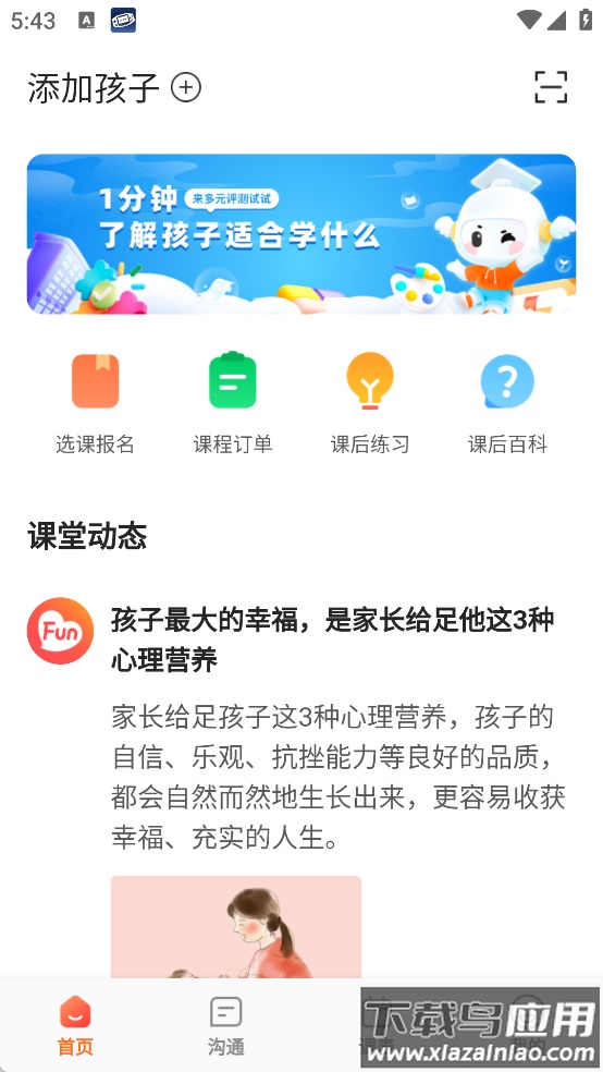 设有选课报名、课程订单、课后练习与课后百科等入口,同时提供课堂动态与相关资讯。