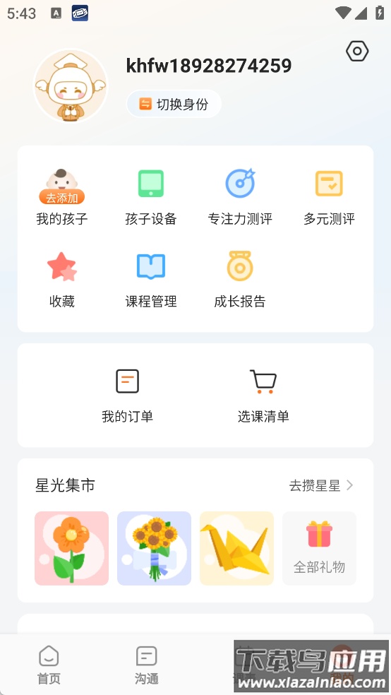 集中管理孩子信息、设备设置、学习测评、课程与订单等;另设有星光集市,可供兑换礼品。