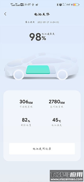 用户还能在应用中查看电池使用记录、剩余续航里程、电池温度以及车辆总行驶里程等详细信息。