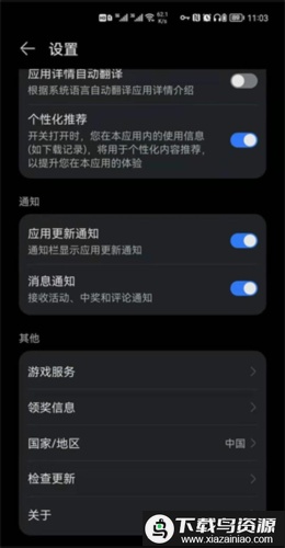 1. 打开华为应用市场,点击右下角“我的”进入个人页面,选择“设置”,在“其他”栏目中找到“国家/地区”选项。