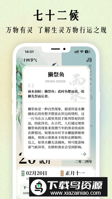 1、内置节气三候与七十二候完整解析,支持语音查询“最近适合晒被的节气”,快速找到相关习俗与禁忌,并附有“端午忌游泳”等典故说明。