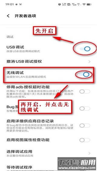 7、在开发者选项中,先开启“USB调试”功能,再开启“无线调试”并点击进入其设置页面。