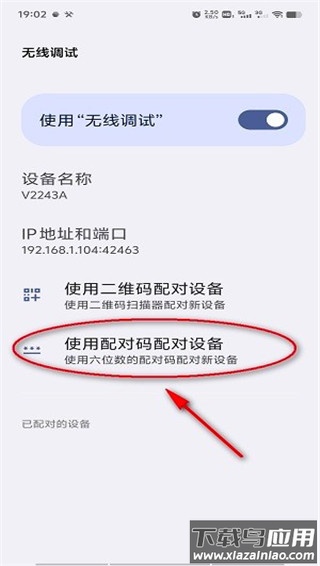 8、在无线调试设置内,选择“使用配对码配对设备”这一选项。