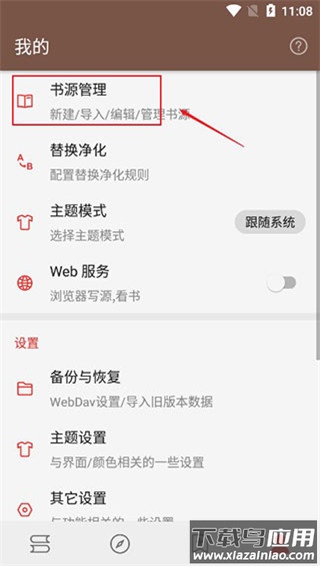 1. 在本站下载并打开酷安阅读app,点击“我的”进入书源管理界面;