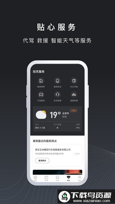 坦克tank手机版是一款功能全面的汽车服务应用,它能细致记录你的每次出行轨迹,方便编辑与分享旅途动态。软件内设商城板块,为你推荐优质车载装备,丰富爱车配置。其智能控车功能让你在线上全面掌握与操作车辆状态,同时整合代驾、救援与智能天气等贴心服务,全方位保障你的出行安全与舒适体验,喜欢的就在本站下载。