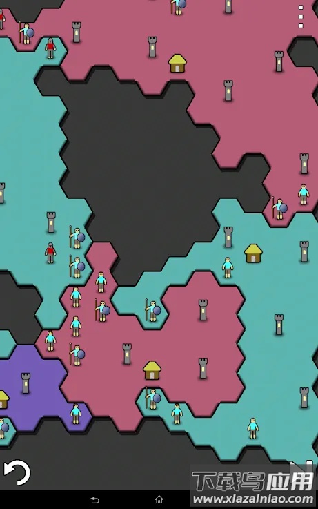 游戏中不同颜色代表不同势力,每个六边形格子都是一块土地。右侧彩色问号代表随机颜色,X号则用于删除地块。