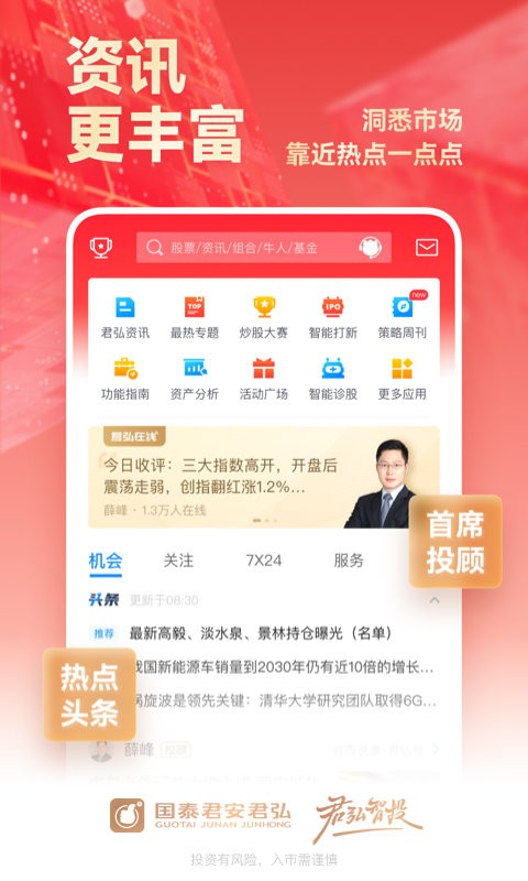 1. 专业研究报告精准推送,由本土实力研究团队为用户定制投资策略;2. 君弘在线直播间提供视听化的干货内容,让资讯获取方式更加生动。