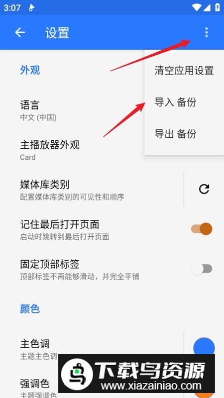 2.在设置页面的右上角点击更多菜单,选择“导入备份”选项。
