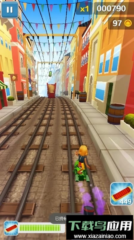 游戏基础操作与同类作品相似:手指上划控制角色跳跃,下划可俯身滑行,左右滑动则能灵活变换轨道。独特之处在于,角色在空中也能进行横向跳跃,操作更为自由流畅。双击屏幕可以召唤滑板,滑板能帮助角色抵挡一次碰撞,相当于提供了额外的保护机会。