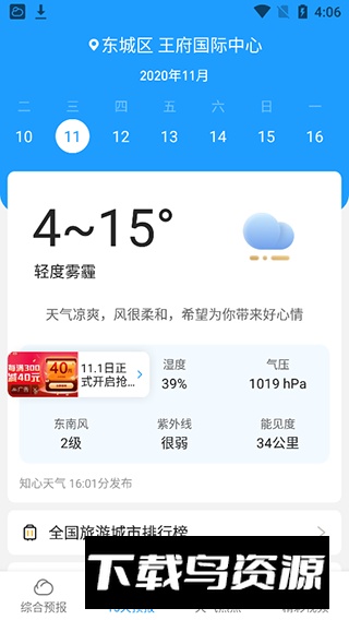2.实时天气预报:监测阴晴雨雪变化,提供分钟级与公里级天气预报,以及未来48小时逐小时预报。